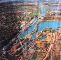 In 1967-1973 a bypass was constructed around the city of Welland to alleviate city traffic and help speed ship traffic through the canal. The twin flight locks in Thorald allow ships to travel in either direction at the same time.